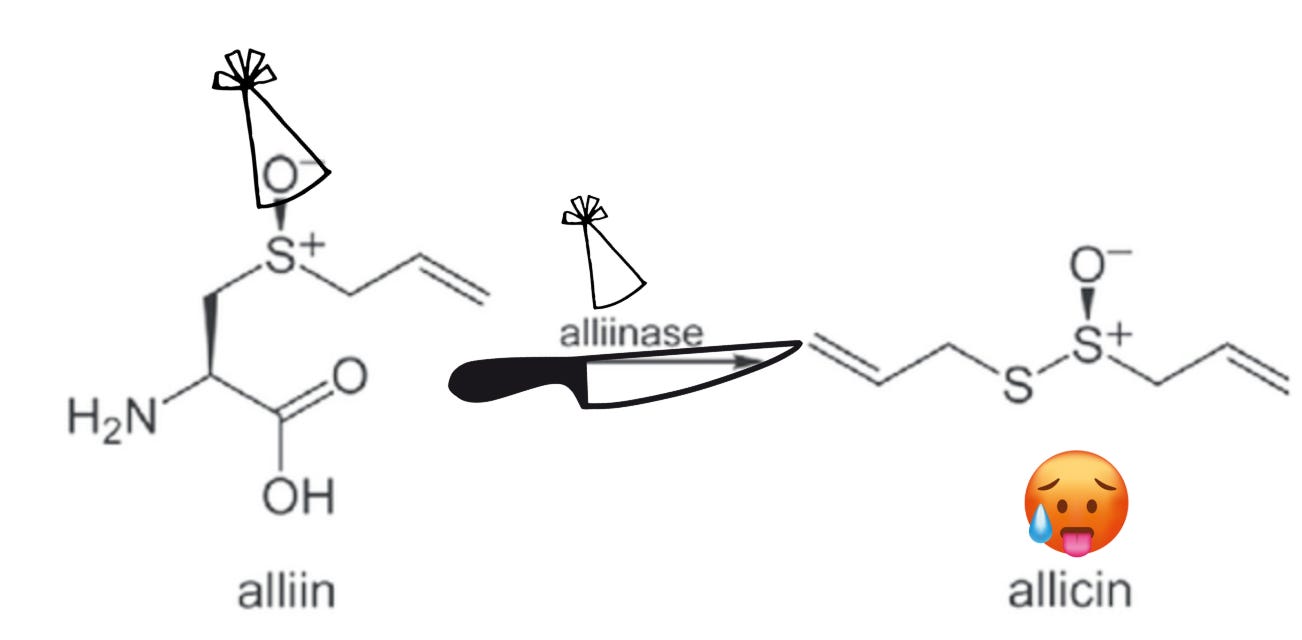 Future newsletters will dive into the anthropological, and agricultural origins of these vegetables, but today we’re going to start with some of the food science. To me, it’s impossible to begin a discussion of garlic without thinking of the spicy pungency of garlic. That piquant punch is caused by allicin, a sulfur-containing compound that sends a burning sensation to our brain by activating certain sensory neurons in our mouth, similar to capsaicin from peppers. However, before being cut or chopped, garlic doesn’t actually contain allicin – it has a precursor molecule called alliin that is relatively tame, and an enzyme called alliinase. The enzyme is what converts alliin to allicin. (Fun fact - the garlic plant makes these sulfurous compounds as a defense mechanism to ward off pests!) Under normal conditions, the allinase is stored in one part of the plant cell (the vacuole) and the alliin is in another (the cytoplasm). Imagine if the alliin is hanging out in the living room of a house and the alliinase is stuffed in the closet. However, as soon as garlic is chopped, crushed, or grated, the plant cells have been physically torn apart, and the allinase is free to immediately begin converting the allin to the spicy form of allicin. In our house analogy, it’s as if chopping, grating or slicing causes the walls of the house to get torn down and the alliinase can now party with the alliin.